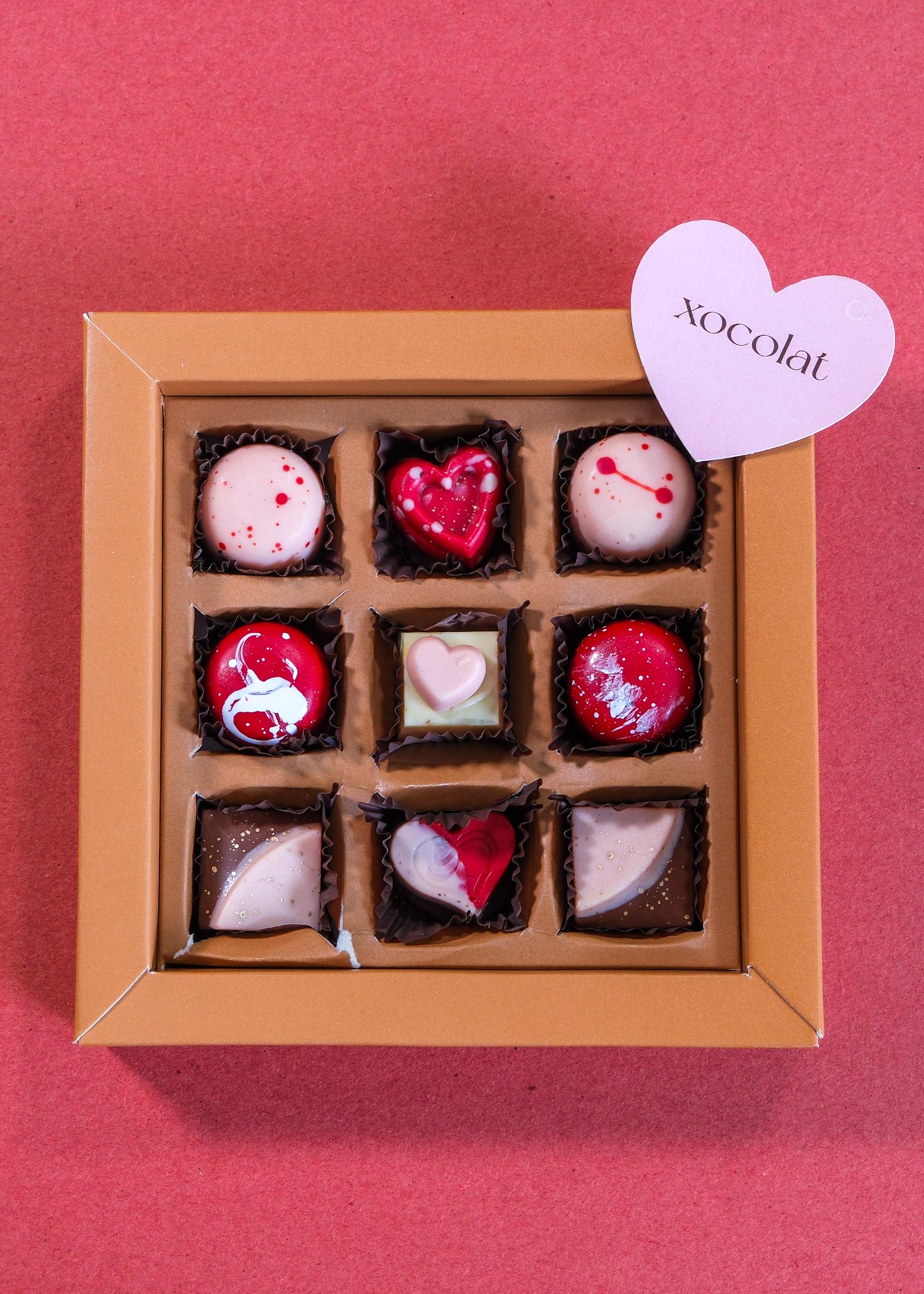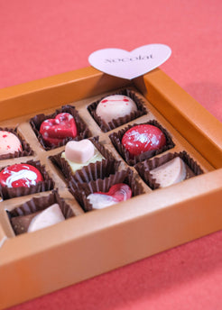Un surtido de 9 bombones Xocolat variados, ideales para regalos o souvenirs de San Valentín. Presentación en caja cartón, de fondo blanco o marrón, con tapas transparentes. Disponible para personalización adicional.